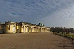 The palace has a single-storey principal block with two flanking side wings. The building occupies almost the entire upper terrace. The potential monotony of the façade is broken by a central bow, its dome rising above the hipped roof, with the name of the palace—remarkably, written with a comma and a full stop, viz. Sans, Souci.—[8][9] on it in gilded bronze letters. The secondary side wings on the garden front are screened by two symmetrical rows of trees each terminating in free-standing trellised gazebos, richly decorated with gilded ornaments.