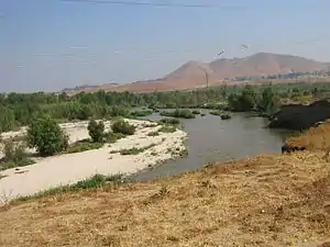 A broad river runs between rocky banks