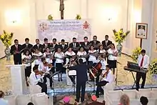 From 2007 onwards, the Choir, under the baton of Rev. Romeo Monteiro, and in association with ex-members and other music lovers, has given several well-appreciated performances of sacred and secular music, in the cities of Panjim, Margao,[1][2] Old Goa. The first performance in this series was held in Old Goa, as a tribute to the great music legend of Goa, the late Maestro Rev. Lourdino Barreto, ex-member and ex-director of the Choir, on the occasion of his tenth death anniversary. The following year, the Cecilian choir presented the secular repertoire of Maestro Barreto at a gala concert held at the Kala Academy, Panjim, where Barreto had served as Director of the Western Music School. The Santa Cecilia Choir also featured at the Monte Festival of Music, Old Goa, in Feb. 2010[3] and the World Konkani Cultural Convention in Mangalore, in Dec. 2010.[4][5] It was a privilege for the Choir which was invited by the Apostolic Nuncio to India, His Excellency Most Rev. Salvatore Pennacchio, on 19–20 April 2012, to New Delhi, to animate the singing at the solemn Eucharist and to present a Programme in honour of Pope Benedict XVI, on the 7th anniversary of His Pontificate.[6] The Gregorian Chants and other soul-lifting liturgical hymns were greatly appreciated by the Apostolic Nuncio and by the Prelates and laity who participated in the Eucharist.