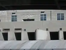 The reservoir formed behind Santa Fe has a maximum capacity of 45,409 acre⋅ft (56,011,000 m3) at spillway crest, 21 feet (6.4 m) below the top of the dam itself. Water releases from the dam are controlled by two sets of gates. The outlet works, located at the base of the dam, are fed by sixteen 7 ft (2.1 m) diameter conduits capable of discharging 17,000 cu ft/s (480 m3/s). The emergency spillway is located to the northwest of the dam and comprises a concrete overflow weir with a capacity of 200,000 cu ft/s (5,700 m3/s).[5]