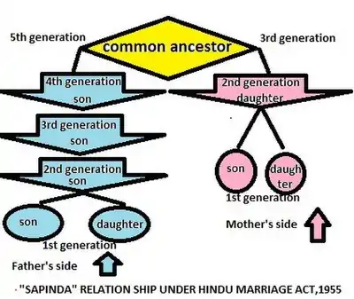 For example, if the bride is the offspring of any person within five generations (inclusive) on the groom's father's side and three generations (inclusive) on the groom's mother's side, or vice versa, they will be referred to as "Sapindas" of each other. In these cases, the Hindu Marriage Act of 1955 bars marriage between two Hindus of this nature.