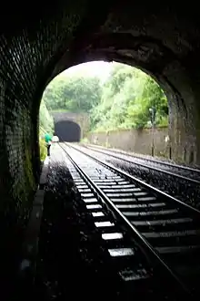 The Sapperton Railway Tunnel is a railway tunnel near Sapperton, Gloucestershire in the United Kingdom. It carries the Golden Valley Line from Stroud to Swindon through the Cotswold escarpment. It was begun by the Cheltenham and Great Western Union railway in 1839 and taken over by the Great Western Railway in 1843, being completed in 1845.[1] There are actually two tunnels, the main one at 1 mi 104 yd (1.704 km) in length,[2] and separated by a short gap, a second at 353 yd (323 m).[3]