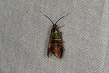 The wingspan is about 20 mm. Adults have forewings that are half a dark golden colour and half iridescent green. The hindwings are plain brown.