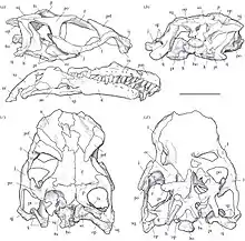 The external naris (skull opening for the nostril) was less than half the size of the orbit (eye socket). It was bordered by the nasal, premaxilla, and, to a small extent, the maxilla, the latter two forming the upper jaw. Between the premaxilla and maxilla there was a large opening, the subnarial foramen. The antorbital fossa, an additional skull opening seen in most dinosaurs that was situated between the external naris and orbit, was less than half the length of the orbit. Much of the upper margin of the orbit was formed by the frontal bone of the skull roof; this bone, however, did not contribute to the front margin of the upper temporal fenestra at the rear end of the skull roof. Instead, this front margin was formed by the postorbital and parietal bones, with the front part of the parietal being forked to connect with the latter. Between the parietal and the supraoccipital, which follows behind the parietal at the back of the skull, was another opening, the postparietal fenestra, which was large in Sarahsaurus. A unique feature of the genus can be found on the underside of the braincase, where a shallow ridge spanned between the basipterygoid processes, bony downwards projections of the braincase that brace the latter against the palate. The lower jaw curved downwards towards its tip, and the jaw joint was located well below the level of the tooth row. There is no evidence for a beak.[2][1]