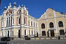 The city's importance was linked to the transportation and commerce of salt from nearby Ocna Dejului (Hungarian: Désakna, German: Salzdorf), possibly already at a very early date.[6] Due to the economic and commercial benefits it began to receive in the 13th century, Satu Mare became an important centre for craft guilds. In the 18th century, intense urbanisation began; several buildings survive from that period, including the old city hall, the inn, a barracks, the Greek Catholic church and the Reformed church. A Roman Catholic diocese was established there in 1804. In 1823, the city's systematization commission was established in order to direct its local government. In 1844, paving operations begun in 1805 were stepped up. The first industrial concerns also opened, including the steam mill, the brick factory, the Neuschloss Factory for wood products, the lumber factory, the Princz Factory and the Unio Factory. Due to its location at the intersection of commercial roads, Szatmárnémeti became an important rail hub. The line to Nagykároly (Carei) was built in 1871, followed in 1872 by a line to Máramarossziget (Sighetu Marmației) line, an 1894 link to Nagybánya (Baia Mare), 1900 to Erdőd (Ardud) and 1906 to Bikszád (Bixad).[9]