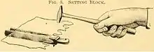 "...lay the block, Fig. [A], in some convenient flat place and hold the tooth of saw so that the point projects over the beveled surface fully one-quarter of an inch. Give two or three strokes with a light hammer, striking the tooth always about one-quarter of an inch from the point. Regulate the set by the use of set gauge..."[2]