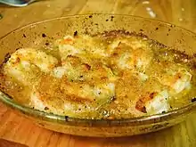In the United States, "shrimp scampi" is the menu name for shrimp in Italian-American cuisine (the actual word for "shrimp" in Italian is gambero or gamberetto, plural gamberi or gamberetti[7]). "Scampi" by itself is a dish of Nephrops norvegicus served in garlic butter, dry white wine and Parmesan cheese, either with bread or over pasta or rice, or sometimes just the shrimp alone. The term "shrimp scampi" is construed as a style of preparation, with variants such as "chicken scampi", "lobster scampi", and "scallop scampi".