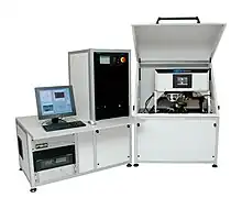 A high temperature Scanning SQUID Microscope using a YBCO SQUID is capable of measuring magnetic fields as small as 20 pT (about 2 million times weaker than the earth's magnetic field). The SQUID sensor is sensitive enough that it can detect a wire even if it is carrying only 10 nA of current at a distance of 100 µm from the SQUID sensor with 1 second averaging. The microscope uses a patented design to allow the sample under investigation to be at room temperature and in air while the SQUID sensor is under vacuum and cooled to less than 80 K using a cryo cooler. No Liquid Nitrogen is used. During non-contact, non-destructive imaging of room temperature samples in air, the system achieves a raw, unprocessed spatial resolution equal to the distance separating the sensor from the current or the effective size of the sensor, whichever is larger. To best locate a wire short in a buried layer, however, a Fast Fourier Transform (FFT) back-evolution technique can be used to transform the magnetic field image into an equivalent map of the current in an integrated circuit or printed wiring board.[4][5] The resulting current map can then be compared to a circuit diagram to determine the fault location. With this post-processing of a magnetic image and the low noise present in SQUID images, it is possible to enhance the spatial resolution by factors of 5 or more over the near-field limited magnetic image. The system's output is displayed as a false-color image of magnetic field strength or current magnitude (after processing) versus position on the sample. After processing to obtain current magnitude, this microscope has been successful at locating shorts in conductors to within ±16 µm at a sensor-current distance of 150 µm.[6]