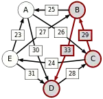 Now the strongest paths have to be identified. To help visualize the strongest paths, the set of pairwise preferences is depicted in the diagram on the right in the form of a directed graph. An arrow from the node representing a candidate X to the one representing a candidate Y is labelled with d[X, Y]. To avoid cluttering the diagram, an arrow has only been drawn from X to Y when d[X, Y] > d[Y, X] (i.e. the table cells with light green background), omitting the one in the opposite direction (the table cells with light red background).