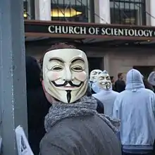 On February 2, 2008, 150 people gathered outside of a Church of Scientology center in Orlando, Florida to hold a protest against the organization's practices.[48][49][50][51] Small protests were also held in Santa Barbara, California,[52] and Manchester, England.[49][53] On February 10, 2008, about 7,000 people protested in more than 93 cities worldwide.[54][55][56] Many protesters wore Guy Fawkes masks inspired by the character V from V for Vendetta, or otherwise disguised their identities, in part to protect themselves from reprisals from the organization.[57][58] Anonymous held a second wave of protests on March 15, 2008, in cities all over the world, including New York, Chicago, Los Angeles, London, Paris, Vancouver, Toronto, Berlin, and Dublin. Anonymous held its third protest against Scientology on April 12, 2008.[59][60] Named "Operation Reconnect", it aimed to increase awareness of the Church of Scientology's disconnection policy.[34] A fourth protest occurred on May 10, 2008, and a fifth (Operation Sea Arrrgh) occurred on June 14, 2008.