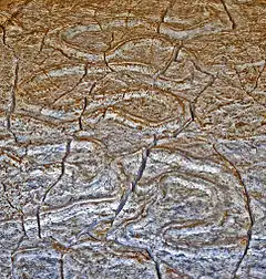 These very common fossil traces are locomotion or feeding traces made by different animal groups in their movement in the mud of the seabed, beneath the sand or in the transition from one to another area. [1]