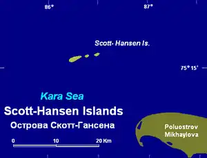 The Scott Hansen Islands (Russian: Острова Скотт-Гансена, Ostrova Skott-Gansena) is a group of three small islands covered with tundra vegetation. It is located in the Kara Sea, about 20 km from the tip of the Mikhailov Peninsula in the coast of Siberia. In many maps these islands appear with the name Scott-Gansen Islands; this version of the name is inspired by the Russian spelling.