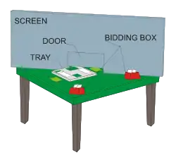 During bidding, calls are made with the cards from the bidding box. The player places the selected call in the bidding tray, which will be visible only on the player's side of the screen. After two players on the same side of the screen have made their calls, North or South (as the case may be) slides the bidding tray under the centre of the screen so as to be visible only to the players on the other side. They in turn make their calls in like manner and the bidding tray is slid back again. This procedure is continued until the auction is completed.