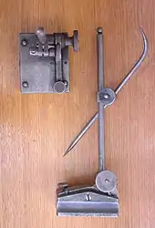 The scriber block has pins that can be pushed to protrude through the base; these can then be used as limit pins to allow the block to press against the edge of the table, controlling its movement in that plane. The upright post can be adjusted to tilt back or forward, effectively moving the scriber point up or down in a controlled fashion; coarse adjustments are made by sliding the scriber along its clamping block.