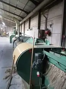 The scutching machine passes the cotton through a pair of rollers, then strikes it with iron or steel bars, called beaters. The rapidly turning beaters strike the cotton hard and knock the seeds out. This process is done over a series of parallel bars, allowing the seeds to fall through. At the same time, air is blown across the bars, which carries the cotton into a cotton chamber.[5] The end result is a continuous sheet of cotton wadding known as a lap, ready for the next stage of the production process, known as carding.[6]