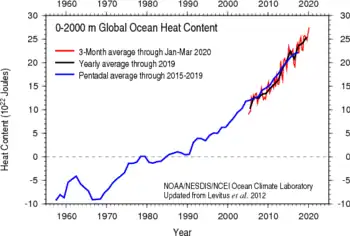 The oceans store more than 90% of the extra heat added to Earth's climate system by climate change and act as a buffer against its effects. The amount of heat needed to increase average temperature of the entire world ocean by 0.01 °C (0.018 °F) would increase atmospheric temperature by approximately 10 °C (18 °F):[58] a small change in the mean temperature of the ocean represents a very large change in the total heat content of the climate system.