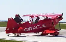 Sean Tucker, a native of Eagle Rock, California, earned his Private Pilot certificate at age 17. His father, William, was an aviation industry lawyer who had learned to fly as part of his job.[3] Tucker started out as a cropduster, eventually starting a cropdusting business in Salinas, California.[4] In order to overcome his fear of crashing, he took an aerobatics course, through which he "found out you could roll an airplane upside down and it wouldn't fall out of the sky."[4] He has been flying airshows worldwide since the mid-1970s and is considered by many to be one of the world's premier airshow performers. Tucker's favorite stunt is the "triple ribbon cut", where he uses his plane to cut three ribbons suspended between poles from three different angles.[4] Despite once having a fear of flying, Tucker has flown more than 1,000 performances at more than 425 airshows, in front of more than 80 million spectators.