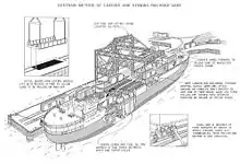 The loading system consisted of a cradle that fit into a depression on the pier. Railway lines running on the pier continued onto the cradle and past it. Rail cars were rolled onto the cradle one at a time, and then lifted by a large overhead crane. The system was very similar to modern intermodal container loading systems, with the exception that it lifted the load from the bottom rather than the top. The crane rolled the cradle over a large hatch slightly longer than the cradle and as wide as the ship. The cradle could be lowered to match one of four internal decks (including the top surface) and moved side-to-side to match one of four parallel sets of rails on the decks. Once positioned, the car was pulled off by steam driven winches. During the voyage of the ship the cars were secured by chocking the wheels and using jacks and turnbuckles at each corner of the car.