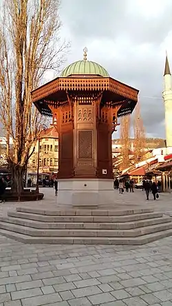 The Sebilj is an Ottoman-style wooden fountain (sebil) in the centre of Baščaršija Square in Sarajevo built by Mehmed Pasha Kukavica in 1753. It was relocated by Austrian architect Alexander Wittek in 1891.[1] According to a local legend, visitors who drink water from this fountain will return to Sarajevo someday.[2]