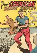 X-9 was a nameless agent who worked for a nameless agency. X-9 used the name "Dexter" in the first story ("It's not my name, but it'll do") and kept using it or being called by it in later stories, but acquired the name "Phil Corrigan" in the 1940s. Decades later, the strip was renamed Secret Agent Corrigan.[2] The nameless agency was also specifically identified as the FBI, but this would be downplayed in the '70s as the Bureau weathered bad publicity and was once more nameless.