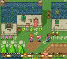 Each character possesses individual strengths and weaknesses. The hero, while unable to use magic, masters weapons at a quicker rate; the girl is a healer, able to cast restorative and support spells; and the sprite casts offensive magic to damage and impair enemies.[4] Upon collecting enough experience points in battle, each character increases in level and improves in areas such as strength and evasion. The trio can rest in towns, where they can regain hit points or purchase restorative items and equipment. Options such as changing equipment, casting spells, or checking status are performed by cycling through the game's Ring Commands, a circular menu which hovers over the currently controlled party member.[2][3][4] The game is momentarily paused whenever the Ring Commands appear.[5]