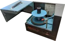 The Seeburg 1000 phonograph was introduced in 1959 as model BMS1.[1] The system replaced the Seeburg Library Unit, which served the same purpose but played standard 45 rpm records. The Seeburg 1000 is enclosed in a metal cabinet 22 inches (55 cm) wide by 14 inches (35 cm) tall by 12 inches (30 cm) deep.[2] A later version (the Seeburg Background Music Compact, model BMC1) is housed in a windowless, blue and grey painted metal box. This version contains only the record-playing mechanism, without any amplifier or timer built in.[3]