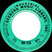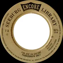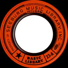 A Seeburg Background Music record is a vinyl record of a non-standard 9 inch (23 cm)-diameter size with a 2 inch (5 cm) center hole. The recording is monaural, with a playing speed of 16⅔ rpm and a density of 420 grooves per inch.[2] A 0.5 mil diamond stylus is used for reproduction. Each side contains approximately 40 minutes of music (typically 20 songs). Records in each series were numbered 1-25 from 1959 to the July 1st 1966 set, and 101-128 from the October 1st 1966 set all the way to the last set. These numbers meant nothing other than an indication as to where a record belonged in the stack order.