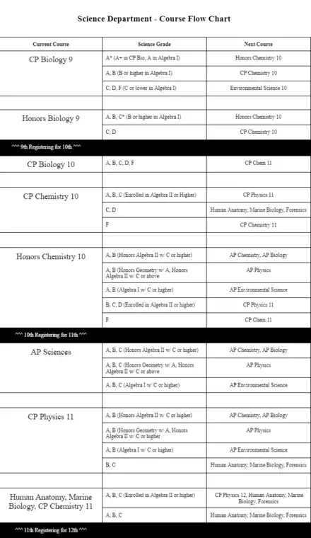 The school is divided into five buildings. Building A houses the main office, library, gym, and the English Department. Building B houses a 430-seat Performing Arts Center as well as the band, choir, and drama classrooms. Building C is labeled "Humanities" and houses the World Languages, Social Sciences, and partially the V.A.P.A. Departments respectively. Building D is the Science building and Building E homes the Mathematics Department.