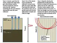The situation is more complex in the case of a dipping reflector, as the first reflection originates from further up the direction of dip (see diagram) and therefore the travel-time plot will show a reduced dip that is defined the “migrator’s equation” :[5]