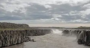 Selfoss (Icelandic pronunciation: [ˈsɛlˌfɔsː]) is a waterfall on the river Jökulsá á Fjöllum in the north of Iceland. The river drops over a number of waterfalls over about 30 km before flowing into Öxarfjörður, a bay of the Arctic Sea. The river originates as melt water from the glacier Vatnajökull and therefore the water flow varies depending on the season, the weather and volcanic activity.[1]