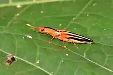 Semiotus distinctus can reach a length of 28–48 millimetres (1.1–1.9 in). Basic colour of the body varies from reddish-yellow to ferrugineous. Pronotum shows a single longitudinal median dark streak and deep scattered punctures, while elytra have two stripes and poorly impressed striae.