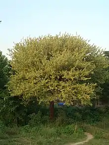 Senegalia modesta (commonly called phulai[2] in Pakistan, phalāhī ਫਲਾਹੀ پھلاہی (Punjabi) in India) is a species of plant commonly found[3] in Pakistan, India[4] and Afghanistan. S. modesta[5] is a perennial[6] tree and formerly, it was classified as Acacia modesta.[2] The plant is drought tolerant.[7] S. modesta`s tree grow in medium size (3 to almost 5 meters)[8] deciduous form with rough surfaced, brown or greenish grey bark, leaflets as (3-5 pairs), cream colored inflorescence (in April–May or July–August) in the form of pedunculate spike, pods as stipitate having 3-5 seeds inside.[9]