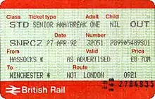 During the early 1970s, some of British Rail's Regions offered a series of small, localised travel promotions for people of or near retirement age. The London Midland and Southern regions were particularly active in this, although other examples existed elsewhere.[1] These promotions were characterised by restricted validity and geographical availability. For example, one Southern Region scheme introduced in 1970 offered pensioners half-price travel at off-peak times on Tuesdays, Wednesdays and Thursdays only, for journeys from a set list of around twenty stations, upon production of their pension book (to confirm their eligibility).[2]