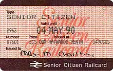 The Senior Railcard is an annual card available to people aged 60 and over, which gives discounts on certain types of railway ticket in Britain. The Railcard has existed in various forms since 1975; the current version is priced at £30.00 and is valid for one year, with a 3-year card available for £70. It is one of a wide variety of discounted and concessionary fare schemes available on Britain's railway network.