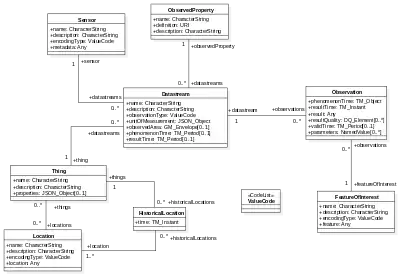 Thing: An object of the physical world (physical things) or the information world (virtual things) that is capable of being identified and integrated into communication networks.[8]Locations: Locates the Thing or the Things it associated with.HistoricalLocations: Set provides the current (i.e., last known) and previous locations of the Thing with their time.Datastream: A collection of Observations and the Observations in a Datastream measure the same ObservedProperty and are produced by the same Sensor.ObservedProperty: Specifies the phenomenon of an Observation.Sensor: An instrument that observes a property or phenomenon with the goal of producing an estimate of the value of the property.Observation: Act of measuring or otherwise determining the value of a property.[9]FeatureOfInterest: An Observation results in a value being assigned to a phenomenon.The phenomenon is a property of a feature, the latter being the FeatureOfInterest of the Observation.[9]