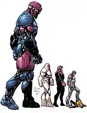 - Adamantium Cyborgs - Near-fully mechanical mutant hunter killers refitted by Weapon X with the titular metal as an endoskeleton using sentinel based nanotech. Coming in numerous alphabetical categorical batches, these bionic weapons can shed their skin revealing a murderous automaton with the abilities of various X-Men heroes & villains integrated into them.[28]