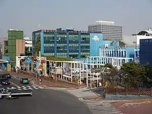 The surrounding neighborhood was developed during the Japanese colonial era[5] and housed the Korean Central Intelligence Agency, which formed in 1961, with their interrogation section in one of the center's buildings.[6] The area has been dubbed ‘Animation Town’,[5] and includes Cartoon Street, which entrance is directly across the street from the center[7][8] The center is an approximate ten minute walk to Myeong-dong Station, downhill along Cartoon Street; with Soongeui Women's College and Namsan's cable car and walking courses nearby, up the mountain.[8]