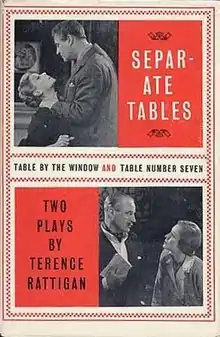 Separate Tables is the collective name of two one-act plays by Terence Rattigan, both taking place in the Beauregard Private Hotel, Bournemouth, on the south coast of England. The first play, titled Table by the Window, focuses on the troubled relationship between a disgraced Labour politician and his ex-wife. The second play, Table Number Seven, is set about 18 months after the events of the previous play, and deals with the touching friendship between a repressed spinster and Major Pollock, a kindly but bogus man posing as an upper-class retired army officer. The two main roles in both plays are written to be played by the same performers. The secondary characters – permanent residents, the hotel's manager, and members of the staff – appear in both plays. The plays are about people who are driven by loneliness into a state of desperation.