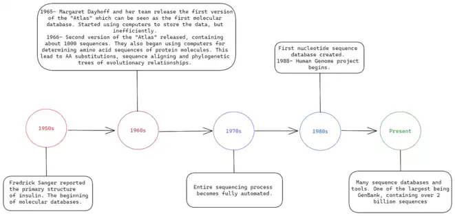 The need for sequence databases originated in 1950 when Fredrick Sanger reported the primary structure of insulin. He won his second Nobel Prize for creating methods for sequencing nucleic acids, and his comparative approach is what sparked other protein biochemists to begin collecting amino acid sequences. Thus marking the beginning of molecular databases.[3]