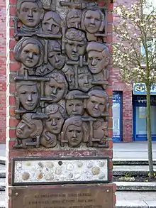 Commemorating the 20 Children of the Bullenhuser Damm Massacre Bronze relief stele, mounted on brick pilaster; below the relief: listing of the childrens names; artist: Leonid Mogilevski (Russian, 1931-); bronze: 0,30m wide 0,60m high; placed July 13, 2001; initiative by and paid for by Hamburg citizens (with Kunststiftung Heinrich Stegemann); marked with an annual commemoration on April 20.[18] Location: