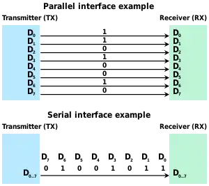 Serial and parallel data transmission of 010010112. Standard bit sequence is least significant bit first (D0 to D7 in acending order).[1] D0 is received first via serial transmission. All bits are received simultaneously via parallel transmission.