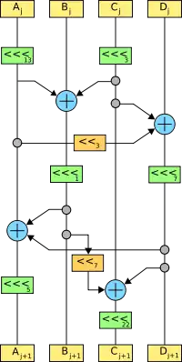 Consists of XOR, S-Box, bit shift left and bit rotate left operations. These operations are performed on 4 32-bit words.
