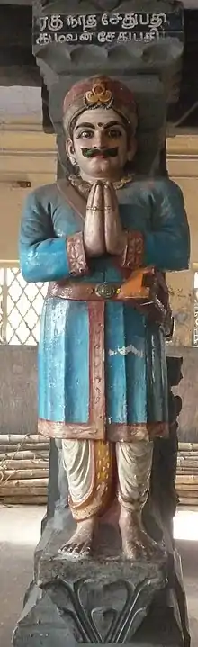 Vijayaraghunatha Sethupathi became the 8th King of Ramnad in 1710 after the death of Kilavan Sethupathy.[16][17] After Kilavan Sethupathi the kingdom was divided into two new Sivaganga Kingdom emerged. During the later period of Sethupathi's rule, the Ramnad was reduced to a zamin level. Then it was brought under the control of the Britishers. Finally it became a part of the Indian Union. Among the later Sethupathis, Bhaskara Sethupathy was an exceptionally enlightened zamindar. And his brother Raja Dhingara Sethupathi were English educated rulers.