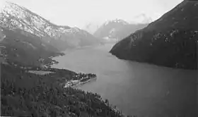 ![]() Seton Lake from Mission Mountain, c. 1950 Shalalth and Ohin on points at left. Looking west toward Mount Brew and Lillooet | |