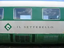 For its entire history Il Settebello was operated by electric multiple-unit trainsets of type ETR 300, and these sets consequently came to be known as "Settebello" type, as they were used exclusively on the Settebello during its period of operation. These trainsets featured rounded ends with passenger observation lounges, allowing passengers to sit at the very front and rear of the train.[2] The operator's cab – or "command cabin" – was in a raised area behind and above the lounge compartment.[2][4] The design made the train distinct from all other trains in Italy and all other high-speed trains of the time. Reservations were required for travel on the Settebello,[6][7] but the seating in the observation areas was unreserved, allowing any passenger on the train to use it.[2]
