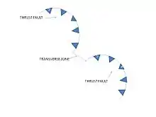 Parallel thrust faults and folds make up a fold-thrust belt on a regional scale. At the local scale segments of the belt are connected by transverse zones. The Charleston transverse zone mentioned earlier runs perpendicular to the thrust faults within the Sevier belt. It has been debated among geologists if this transverse zone developed during the Sevier orogeny or the Uinta/Cottonwood arch formation during the Laramide orogeny.[10] Mapping Sevier thrusting in the Basin and Range Province suggests Sevier structures curve around the Uinta/Cottonwood arch defining the Uinta recess. Looking closely at Sevier faults in American Fork Canyon indicate that these faults are the oldest in the Charleston transverse zone suggested by cross cutting relationships observed in the area.[12]