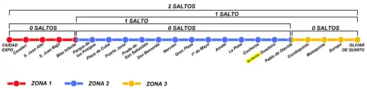 In line 1 of the metro of Seville, the various rates are established according to the number of segment transfers that the user requires in order to travel from the original station to the final one. For this reason, the line is subdivided zones with different rates, which generally correspond with the borders of the municipalities of Seville and the rest of the metropolitan area through which the line runs. The stations of Blas Infante and Pablo de Olavide serve as the two nexuses between the three zones, and as such, any user moving from a zone to one of these two points does not pay the segment transfer fee.