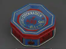 A sewing needle, used for hand-sewing, is a long slender tool with a pointed tip at one end and a hole (or eye) to hold the sewing thread. The earliest needles were made of bone or wood; modern needles are manufactured from high carbon steel wire and are nickel- or 18K gold-plated for corrosion resistance. High quality embroidery needles are plated with two-thirds platinum and one-third titanium alloy. Traditionally, needles have been kept in needle books or needlecases which have become objects of adornment.[1] Sewing needles may also be kept in an étui, a small box that held needles and other items such as scissors, pencils and tweezers.[2]