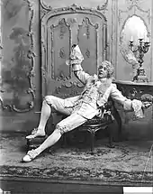 In The Dashing Little Duke (1909; with C. Hayden Coffin, Courtice Pounds and Louie Pounds), produced by Hicks at the Hicks Theatre, which was less successful, Hicks' wife played the title role (a woman playing a man).[14] When she missed several performances due to illness, Hicks played the role – possibly the only case in the history of a musical where a husband succeeded to his wife's role. The piece was based on A Court Scandal, in which Hicks had played in 1899. Hicks then wrote and starred in Captain Kidd (1910), an adaptation with music and lyrics by Leslie Stuart and Adrian Ross, of the American farce The Dictator (1904 by Richard Harding Davis).[15] This flopped, bringing an end to the era of supremacy in London's musical theatre of Hicks and Terriss.[16] Hicks appeared in his first Shakespeare play that year, Richard III. The same year, he penned the first of several autobiographies. The following year, he took a company on a tour of South Africa. After the outbreak of World War I, Hicks was the first British actor to bring a tour to France (with Terriss), giving concerts to British troops at the front. Because of this, he was awarded the French Croix de Guerre. Hicks was briefly declared bankrupt in 1915.[17][18]
