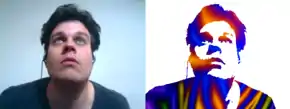 Another use of shaders is for special effects, even on 2D images, (e.g., a photo from a webcam). The unaltered, unshaded image is on the left, and the same image has a shader applied on the right. This shader works by replacing all light areas of the image with white, and all dark areas with a brightly colored texture.